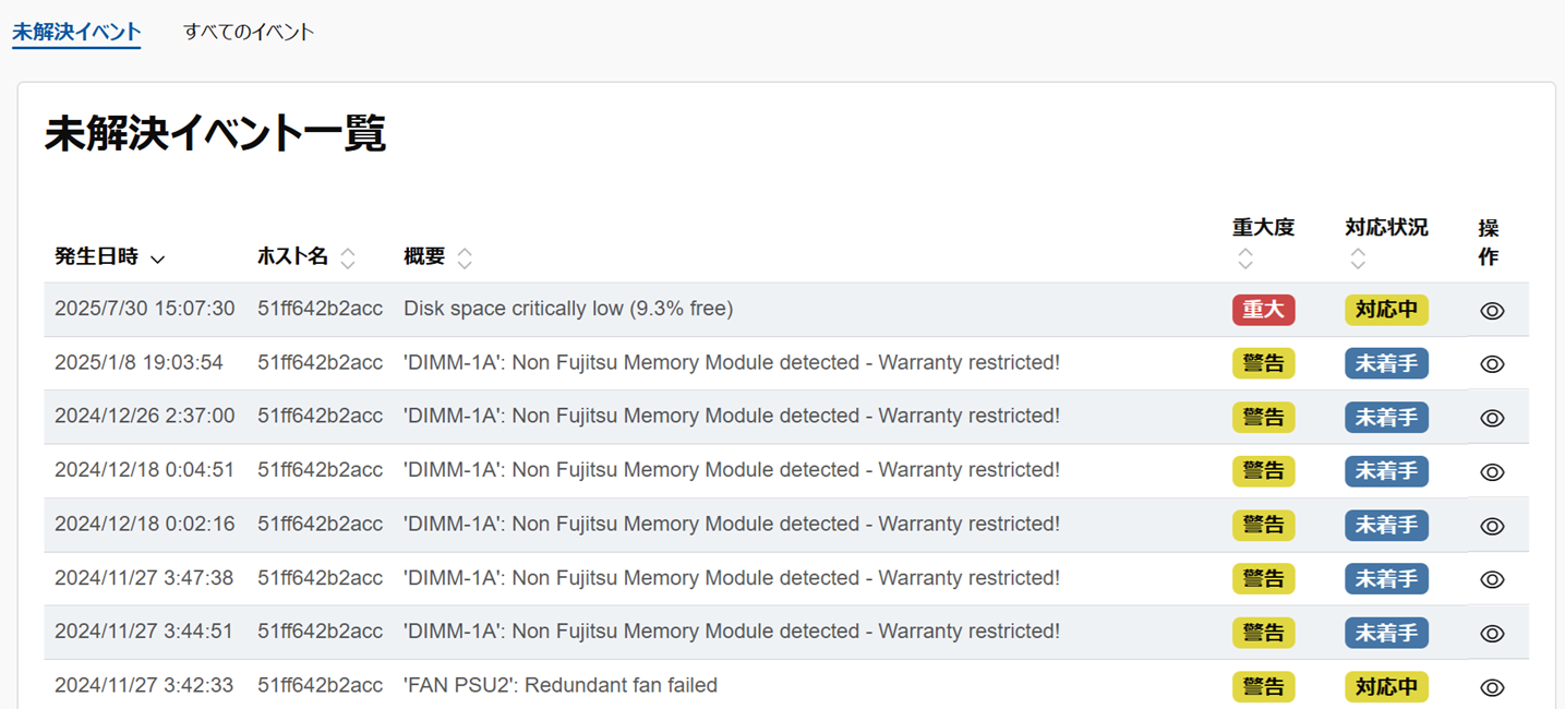 | ホスト名 | イベントが発生している装置のホスト名です。クリックするとサーバー詳細画面に遷移します。 | |